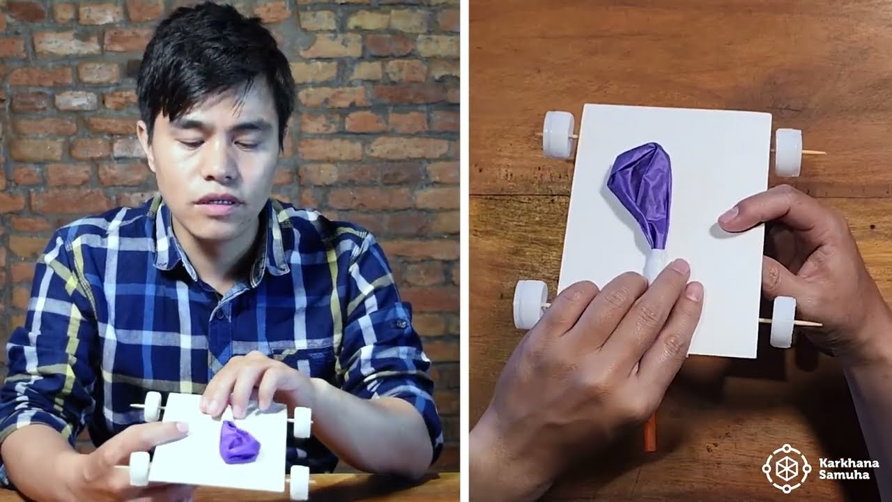 Create a simple toy car that moves by pushing air in the opposite direction.